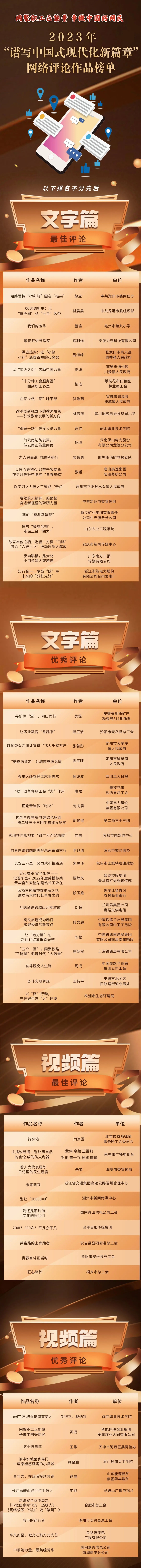 2023年全国“网聚职工正能量 争做中国好网民”网络评论作品榜单揭晓