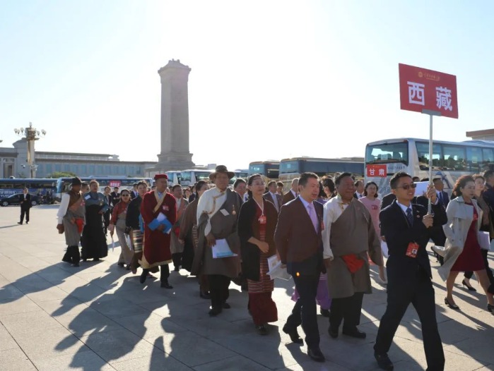 10月9日上午,中国工会十八大开幕式前,西藏自治区代表穿过天安门广场,有序步入北京人民大会堂。(旦增罗珍 摄)