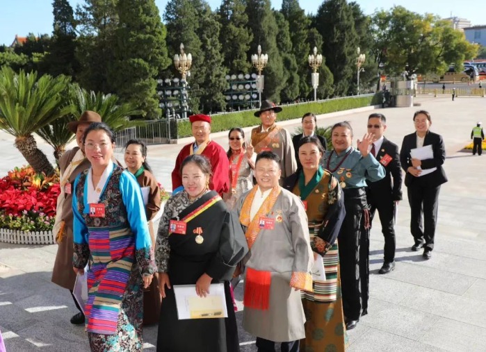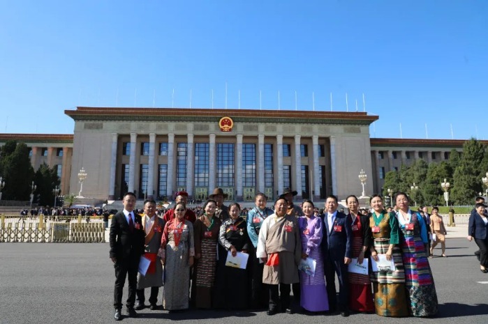 10月9日上午,中国工会十八大开幕式结束后,西藏自治区代表在人民大会堂前合影留念。(旦增罗珍 摄)