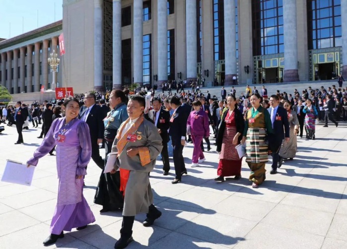10月9日上午,中国工会十八大开幕式结束后,西藏自治区代表昂首阔步走出会堂。(旦增罗珍 摄)
