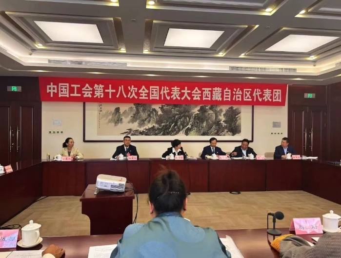 10月9日,西藏代表团进行分团讨论,认真学习党中央领导同志讲话,讨论审议工会十八大报告。会上代表踊跃发言,畅谈体会。(田皓 摄)