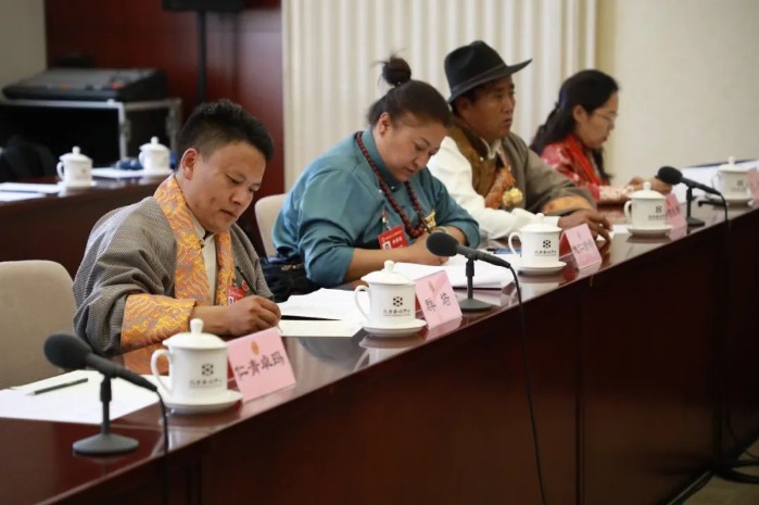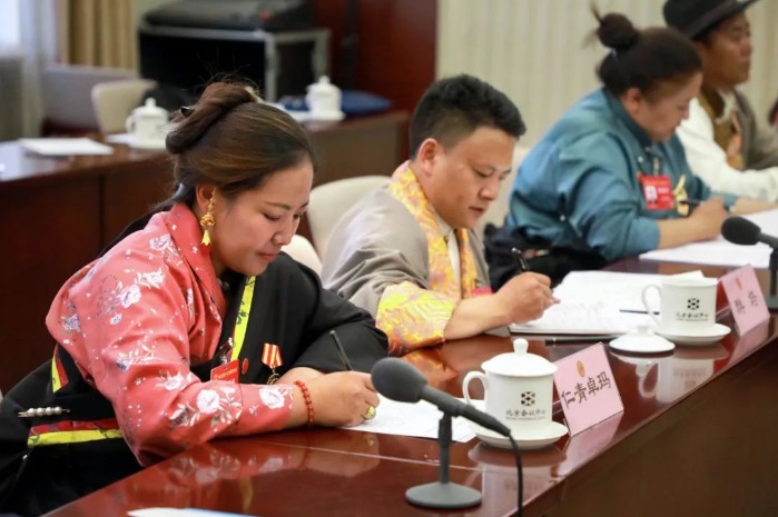 10月9日,西藏代表团进行分团讨论,认真学习党中央领导同志讲话,讨论审议工会十八大报告。会上代表踊跃发言,畅谈体会。(旦增罗珍 摄)
