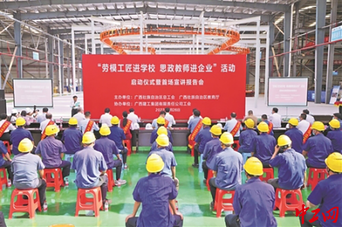 深入实施“常学力行守信念,八桂职工跟党走”思想政治引领行动,2022年11月17日,广西壮族自治区总工会部署开展“百名产业工人百场宣讲”(简称“双百”)活动,组建由100名产业工人组成的广西产业工人宣导团,分自治区、市、县(市、区)层级组织宣导团举办不少于100场宣讲。同时开展“劳模工匠进学校、思政教师进企业”(简称“双进”)活动,组织各级劳模工匠走进校园,各大中小学思政教师走进企业,宣讲敬业履职、匠心筑梦、奋斗圆梦故事,以及党的理论和路线方针政策……截至目前,共开展530多场“双进”活动、132场“双百”活动。