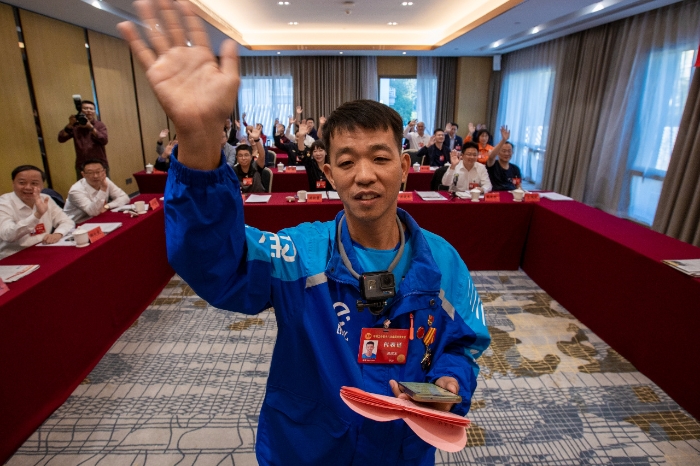 大屏幕前,福建省泉州南安市触手可得饿了么外卖小哥洪成木代表拿着粉色心形纸片,站得笔直。大屏幕上,南安市新华街工会户外劳动者驿站里的实时画面在工会干部们的操控下闪现到了洪成木的面前。“看到成木了,成木你好!”向洪成木问好的是他的同事们。代表进京前,他们把对工会的期盼都写在了心形纸片上。洪成木答应他们要把这些“心声”送进北京人民大会堂。
