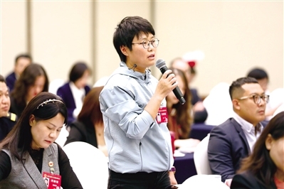 张苇(中)在中国工会十八大广东省代表团全体代表会议上发言。