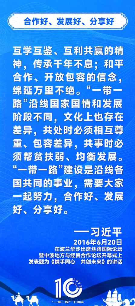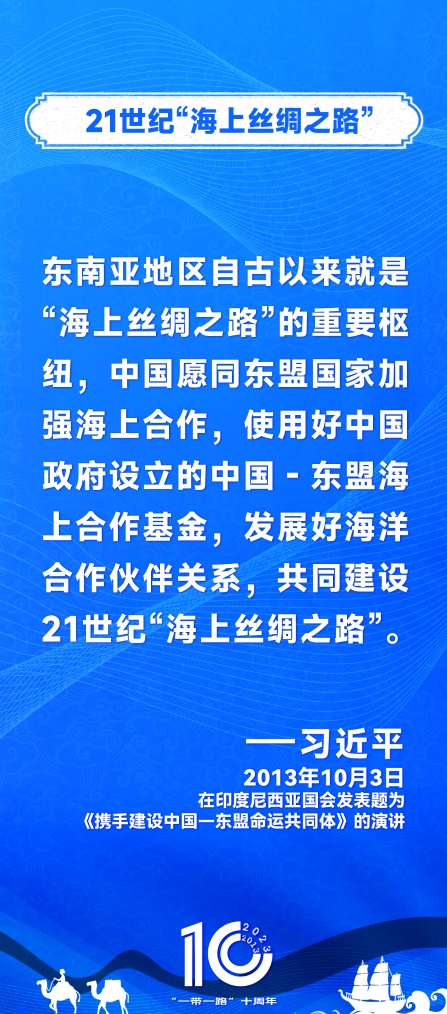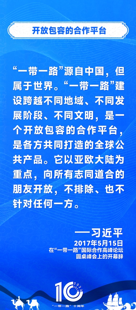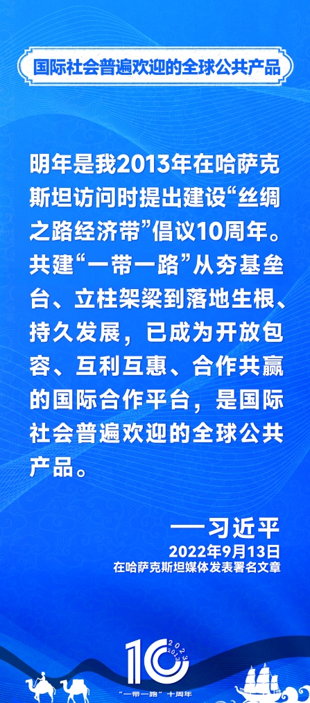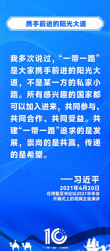 10年前,习近平主席提出共建“丝绸之路经济带”和“21世纪海上丝绸之路”,即共建“一带一路”倡议。过去10年来,习近平主席在多个场合发表讲话和署名文章,为世界描绘了共建“一带一路”互联互通、合作共赢的宏伟蓝图。
