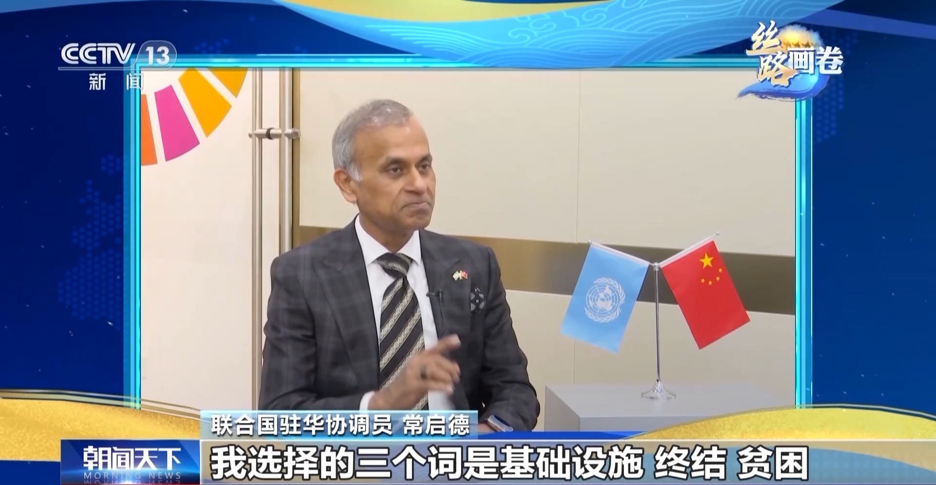 联合国驻华协调员 常启德:我选择的三个词是基础设施、终结、贫困。为什么呢?中国有句老话说“要想富 先修路”。基础设施是一个国家实现发展繁荣的基础,互联互通变得至关重要。无论是数字连通、海上连通还是陆上连通,所有这些都对促进全人类发展非常重要。因此,我认为共建“一带一路”倡议不仅对中国,对全球都至关重要。