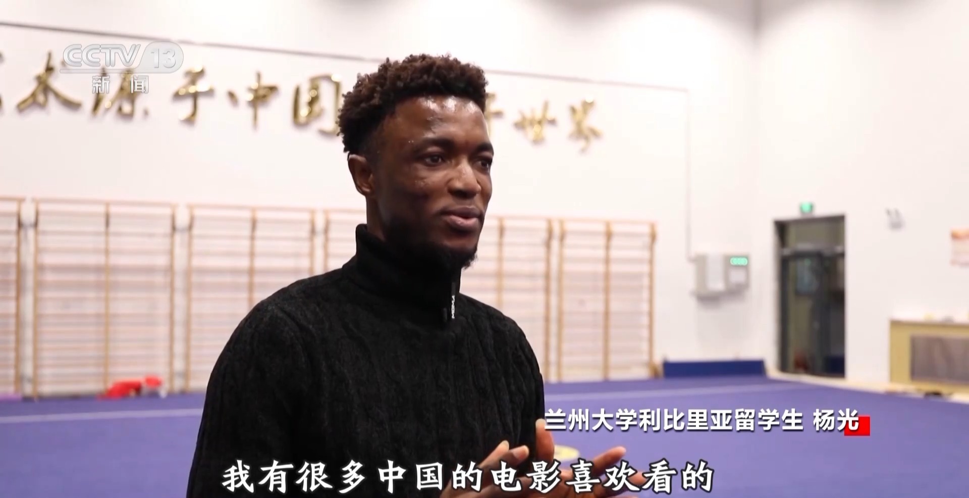 兰州大学利比里亚留学生 杨光:我已经学中文一年半了,我喜欢中文,最喜欢武术。我有很多中国的电影喜欢看的,特别是成龙的电影,因为他的动作很多。