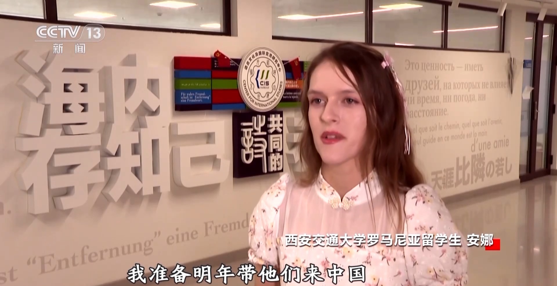 西安交通大学罗马尼亚留学生 安娜:我父母对中国非常感兴趣,我准备明年带他们来中国,去体验一下真正的中国,因为可能在国外很多人他们没有来到中国之前,会对中国还有对中国人有很多偏见,但是我相信他们来到这边,他们的想法会完全变了。因为这边的中国跟他们想象的中国是完全不一样的。