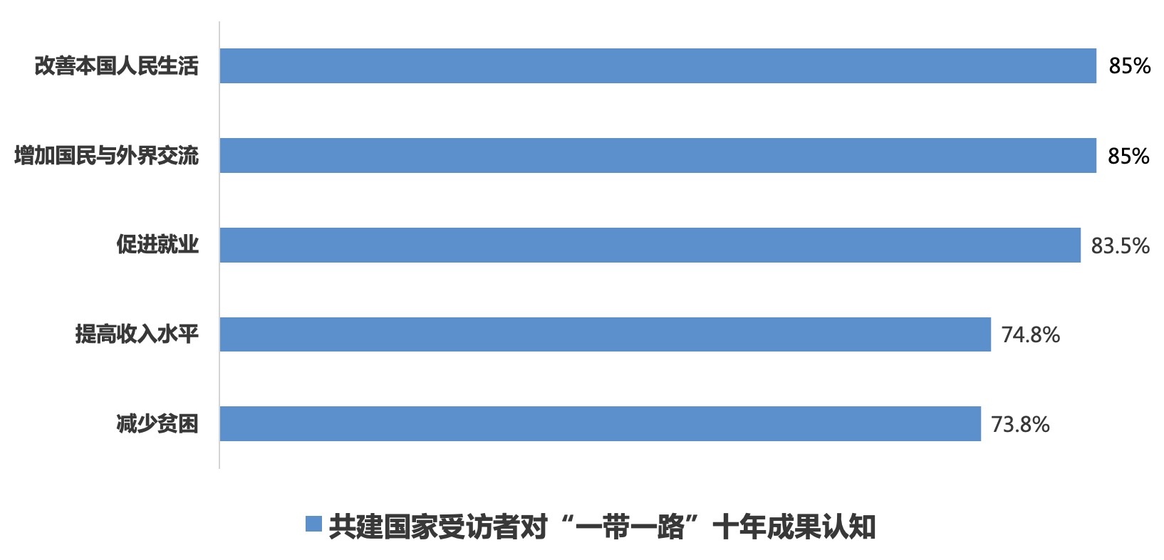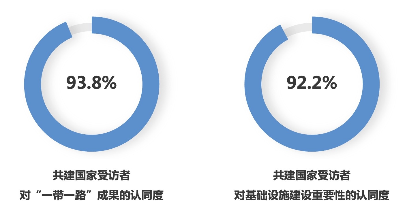 “一带一路”倡议下一个个“惠而实”的民生工程、民心工程,为各国人民带来实实在在的获得感、幸福感和安全感,85%的共建国家受访者认为“一带一路”切实改善了本国人民的生活;85%的共建国家受访者认为通过“一带一路”民众获得了更多与外界交流互鉴的机会;分别有83.5%、74.8%和73.8%的共建国家受访者认可共建“一带一路”在促进就业、提高居民收入水平和减少贫困方面的作用;86.5%的共建国家受访者认为“一带一路”倡议和“以人民为中心”的理念高度契合,惠及全球民众的愿景正在逐步变为现实。