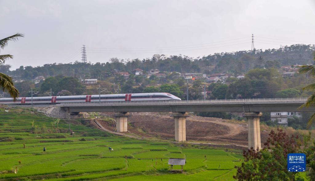这是10月16日在印度尼西亚帕达拉朗拍摄的一列行驶中的雅万高铁高速动车组列车。新华社记者 徐钦 摄