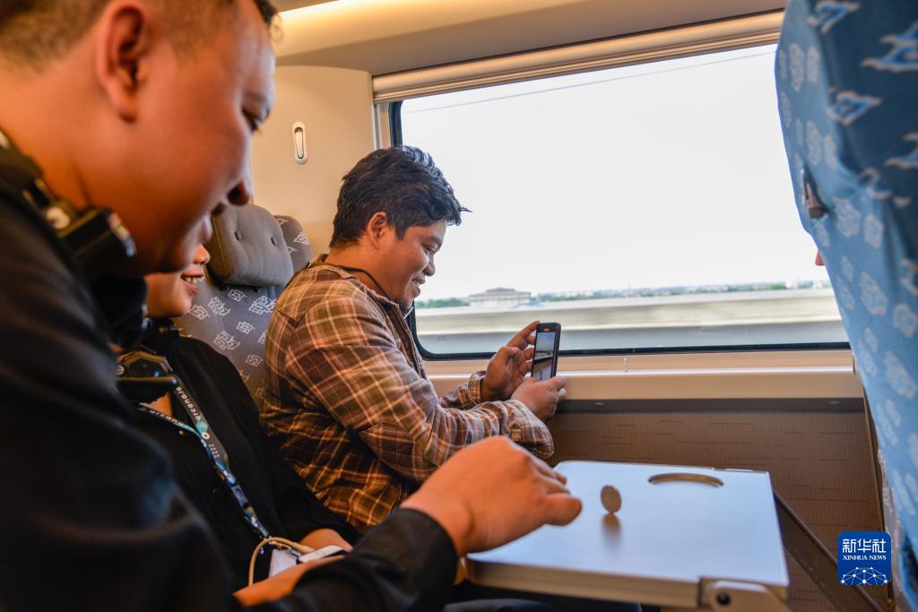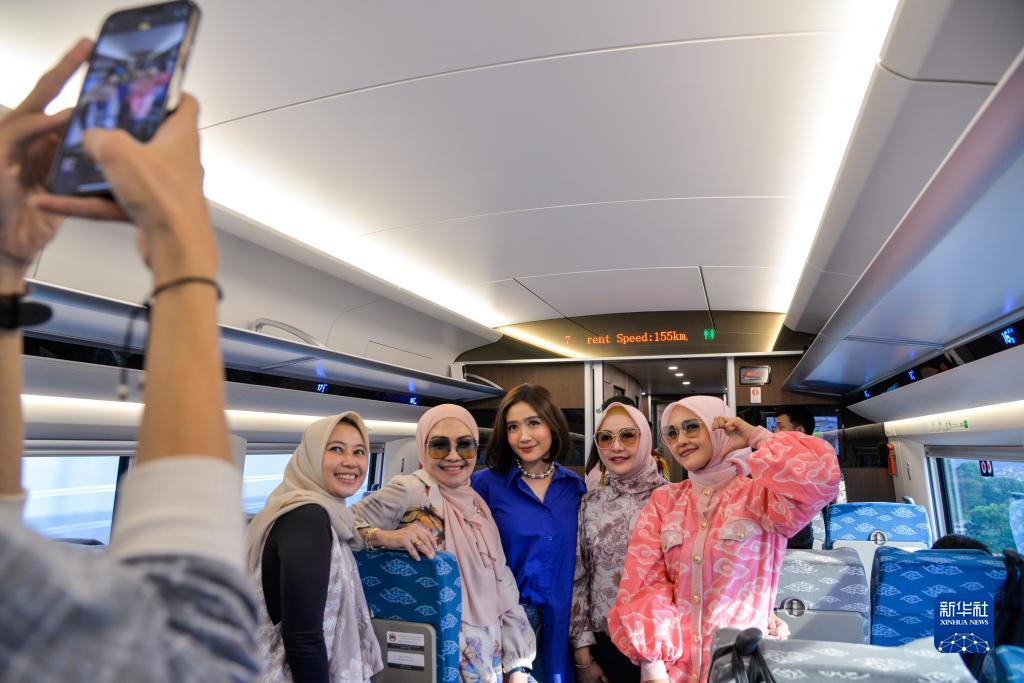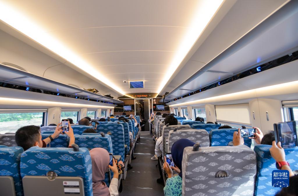10月17日,乘客在行驶中的雅万高铁高速动车组列车车厢内拍照。新华社记者 徐钦 摄
