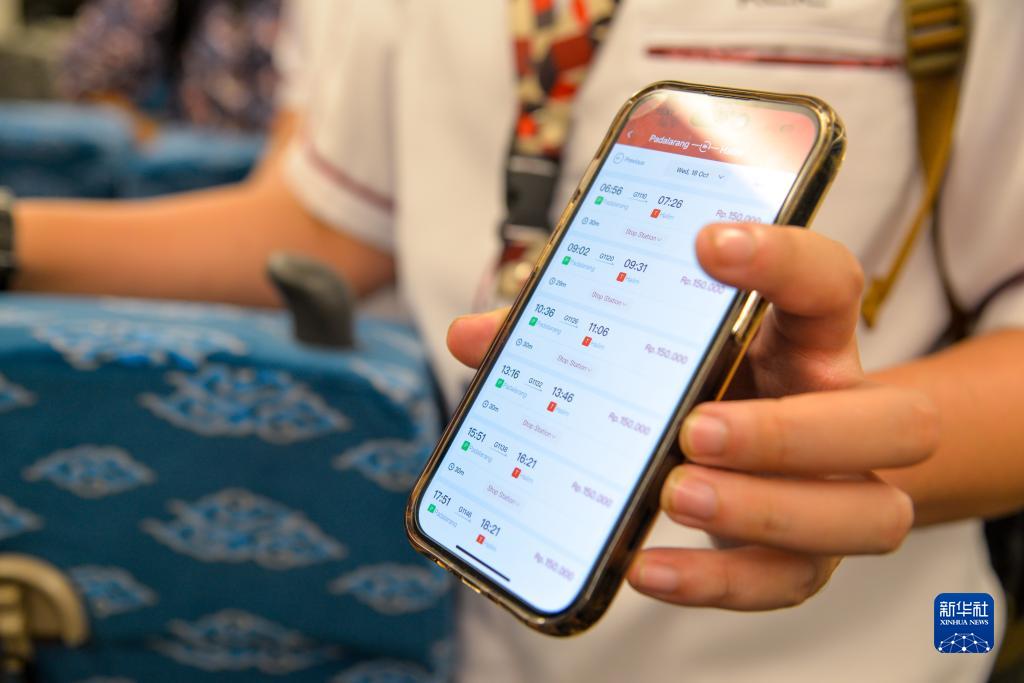 10月17日,一名乘客在行驶中的雅万高铁高速动车组列车车厢内展示雅万高铁购票手机应用。新华社记者 徐钦 摄