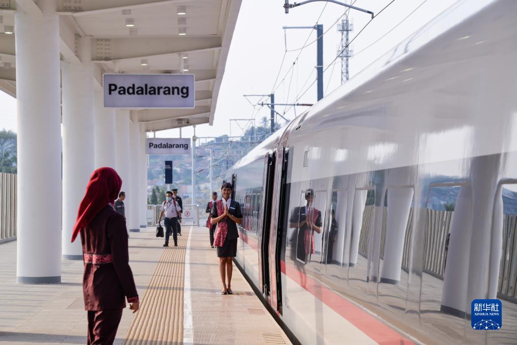 10月17日,雅万高铁高速动车组列车停靠在印度尼西亚帕达拉朗站台上。新华社记者 徐钦 摄