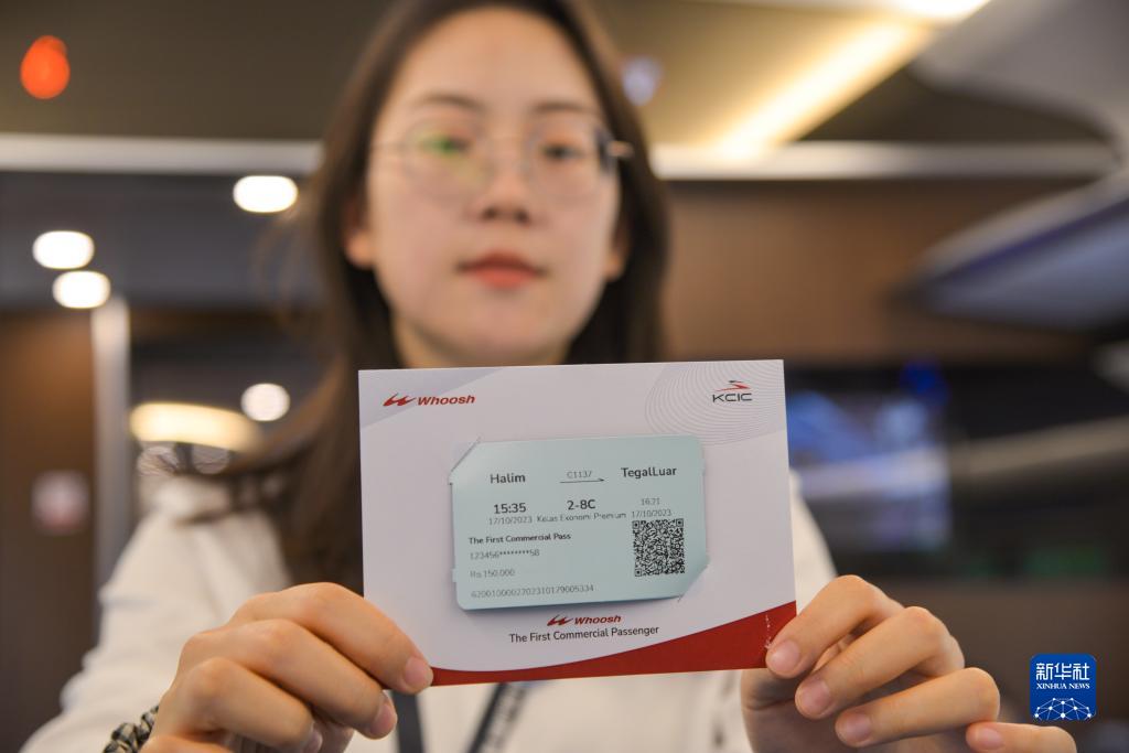 10月17日,乘客在行驶中的雅万高铁高速动车组列车车厢内展示纪念车票。新华社记者 徐钦 摄