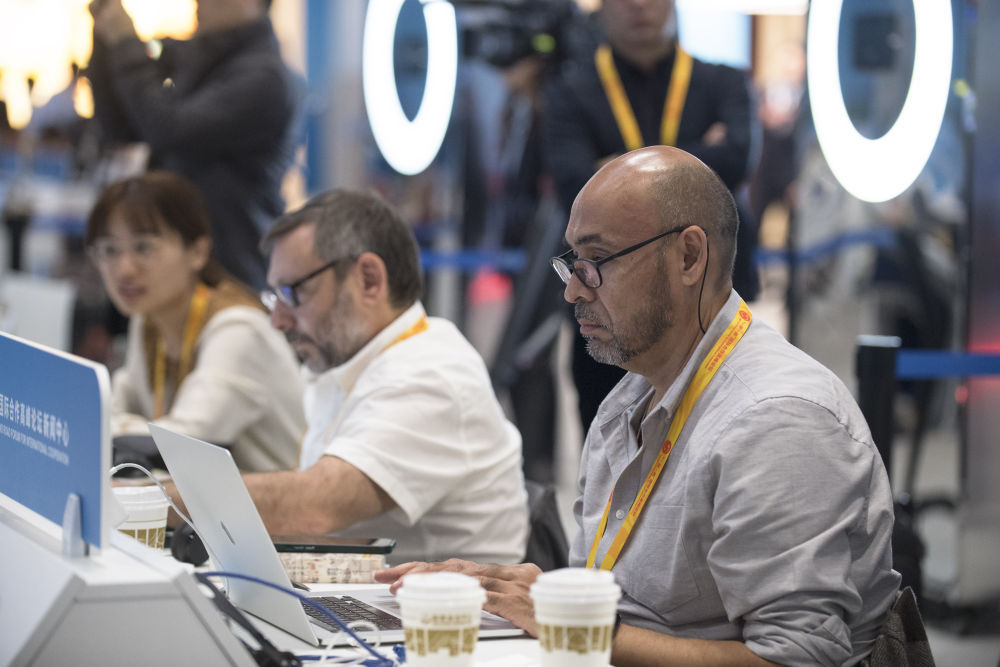 记者在“一带一路”国际合作高峰论坛新闻中心工作(2023年10月17日摄)。