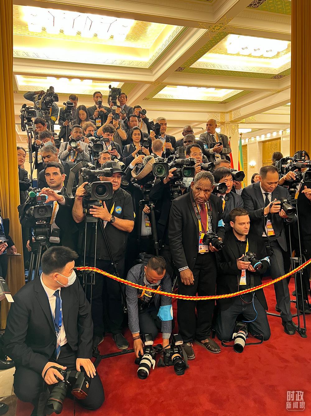 △这是欢迎宴会开始前,各国记者等待拍摄集体合影。(总台央视记者沈忱拍摄)