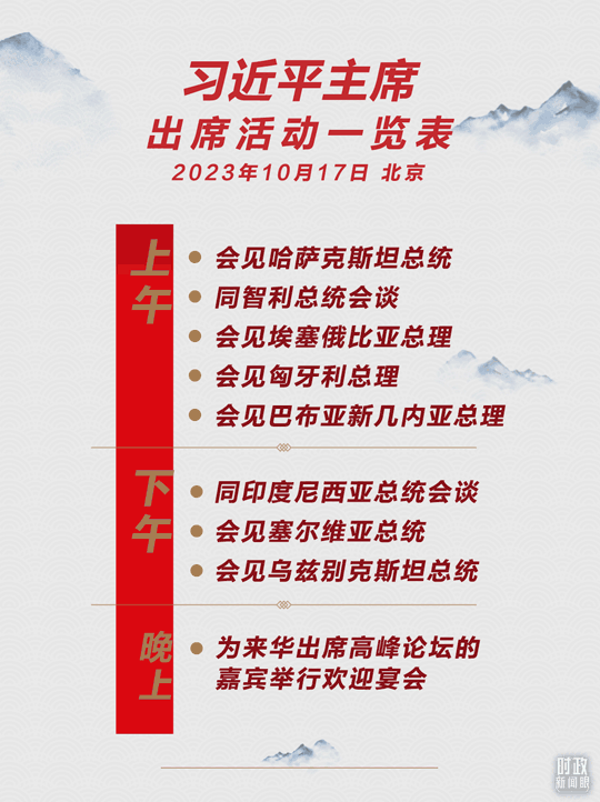 10月17日当天,习近平主席在人民大会堂先后同8位外国领导人举行会谈会见。