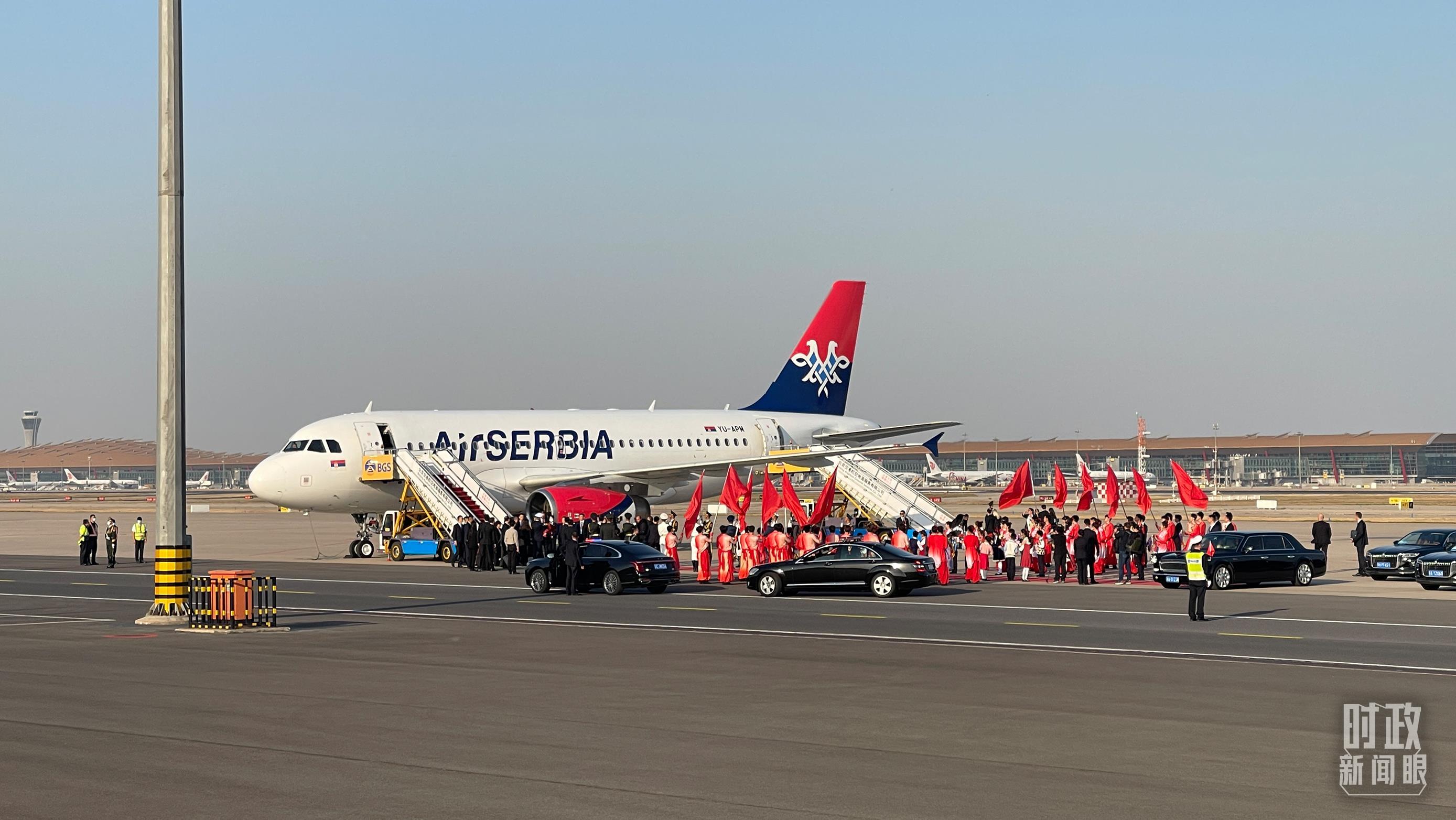 △16日下午,塞尔维亚总统武契奇乘坐的飞机抵达北京。(总台央视记者周锟拍摄)
