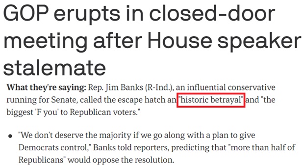 共和党议员吉姆·班克斯称,与民主党人合作将是对共和党选民的“历史性背叛”,意味着“我们不配当众议院的多数党”。