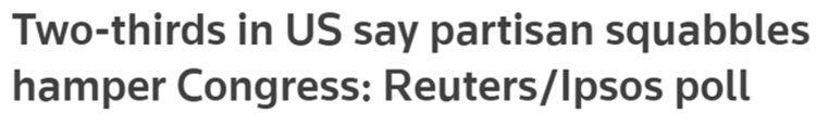 路透社和益普索集团不久前联合进行的一项民调显示,近三分之二(约64%)的美国民众认为,美国两党政客因执迷于党派斗争而无法正常履职。