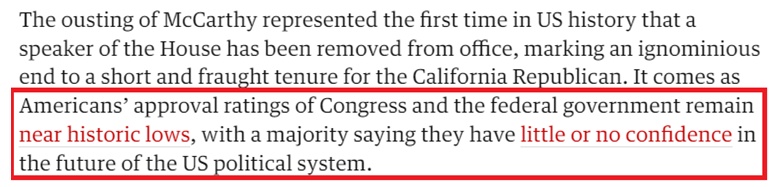 英国《卫报》也在一篇报道中指出,目前美国人对国会和联邦政府的支持率已接近历史最低点,大多数人对美国政治体系的未来几乎没有信心。