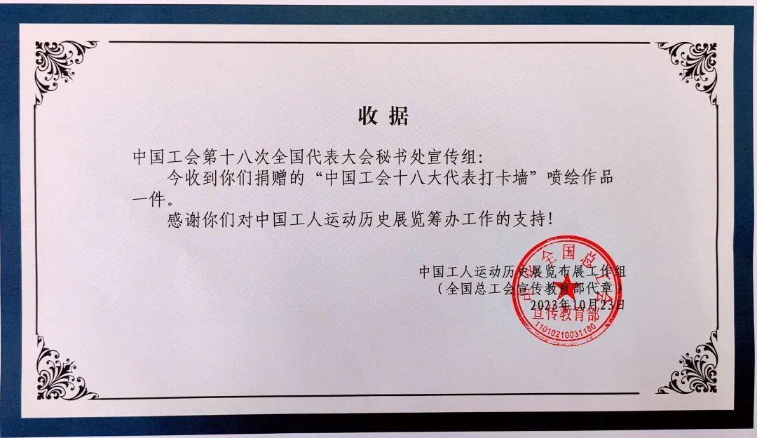 10月23日,中国工会第十八次全国代表大会秘书处宣传组向中国工人运动历史展览布展工作组正式捐赠“中国工会十八大代表打卡墙”。