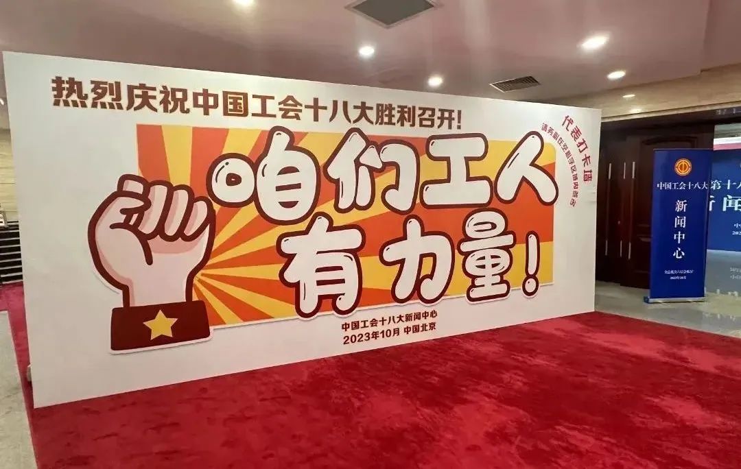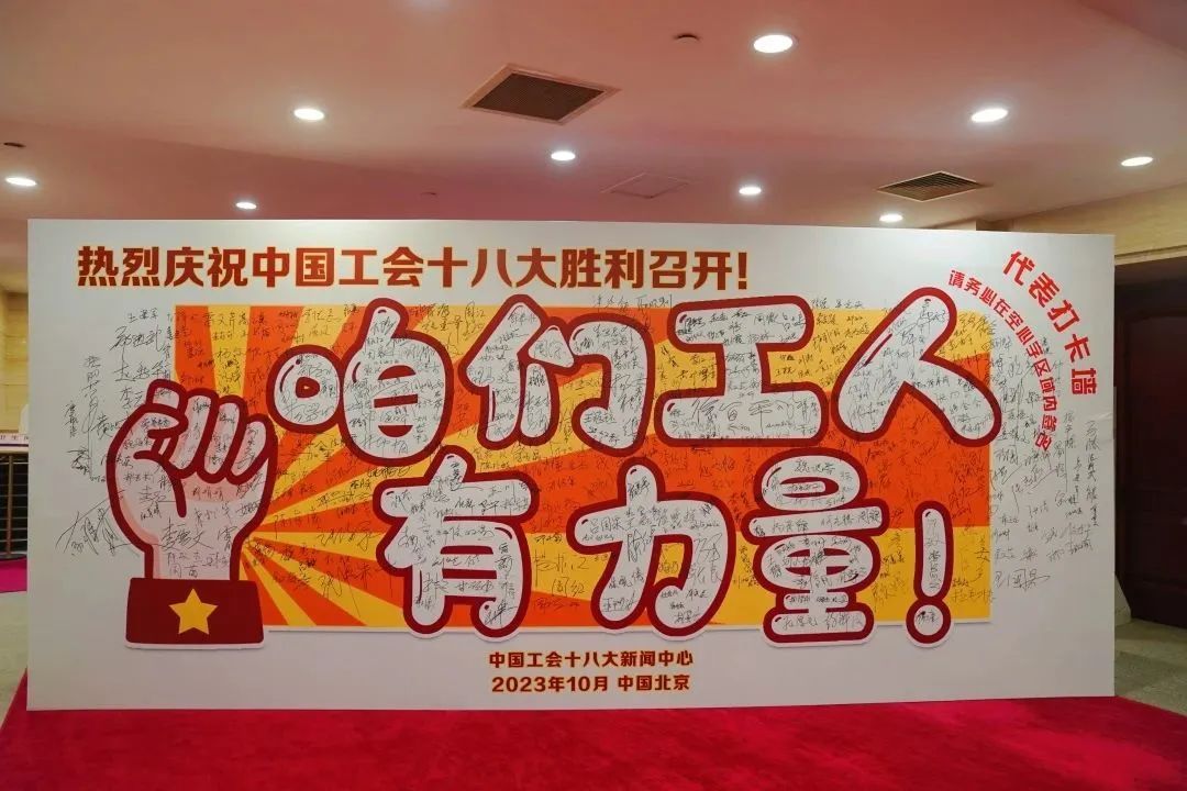 10月9日至12日,中国工会十八大在北京胜利召开。大会期间,中国工会十八大秘书处宣传组在全国总工会机关设立新闻中心,邀请各团代表“回娘家”。20多个代表团的1000余名代表先后来到新闻中心接受采访,讲述履职故事、传递职工呼声、见证媒体发展。宣传组为代表专设的“中国工会十八大代表打卡墙”吸引众人驻足,打卡墙上绘有空心的“咱们工人有力量”大字。