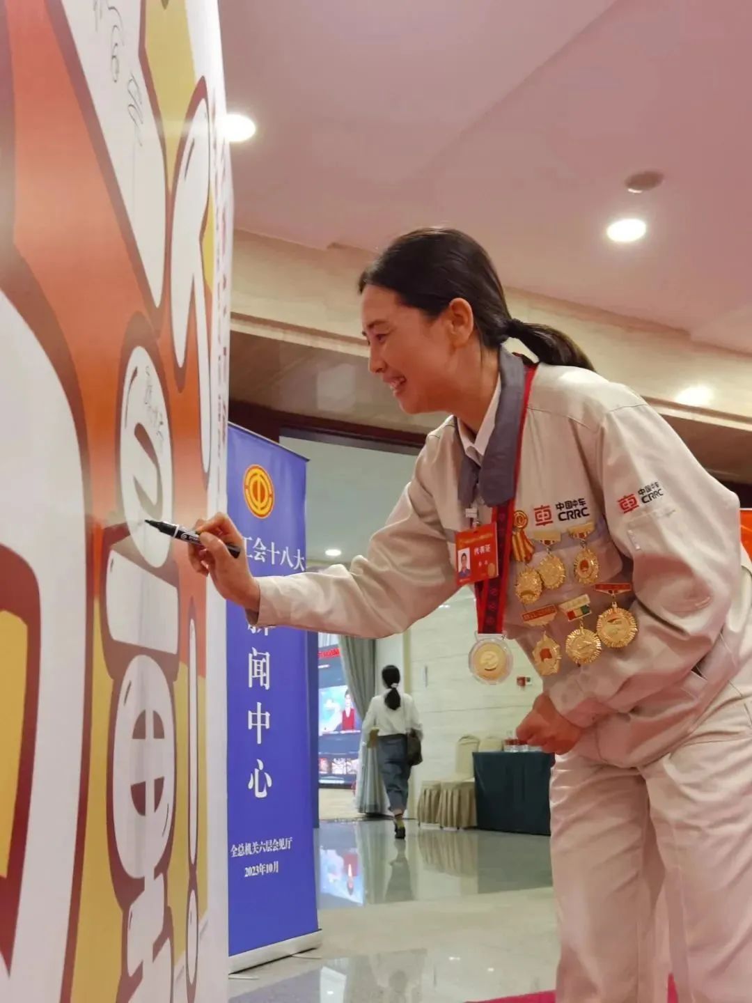 湖南团代表、大国工匠、女焊工易冉在打卡墙签名。