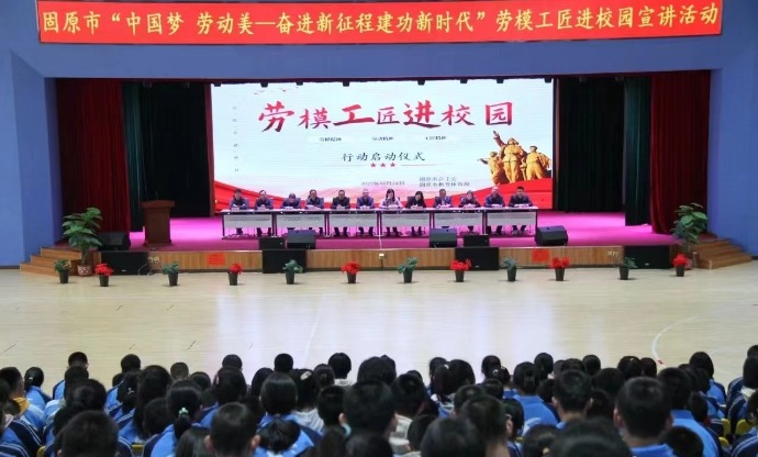 10月24日,宁夏固原市总工会、市教育体育局在固原市第八中学举行“中国梦·劳动美——奋进新征程建功新时代”劳模工匠进校园行动启动仪式暨首场宣讲活动。