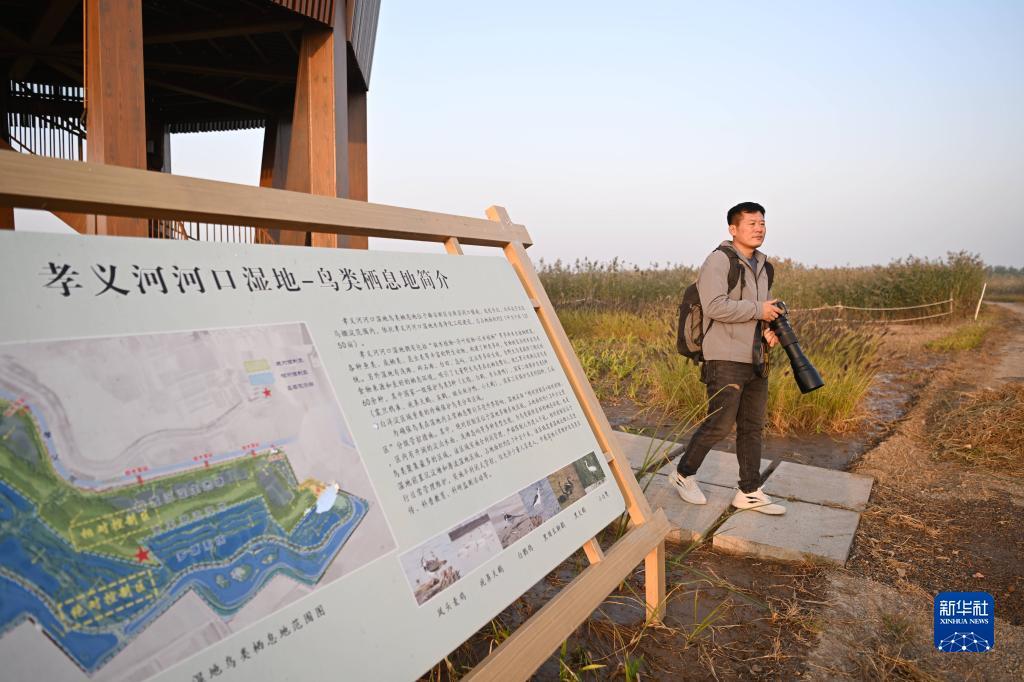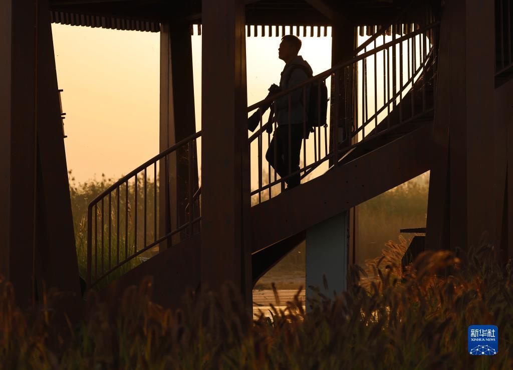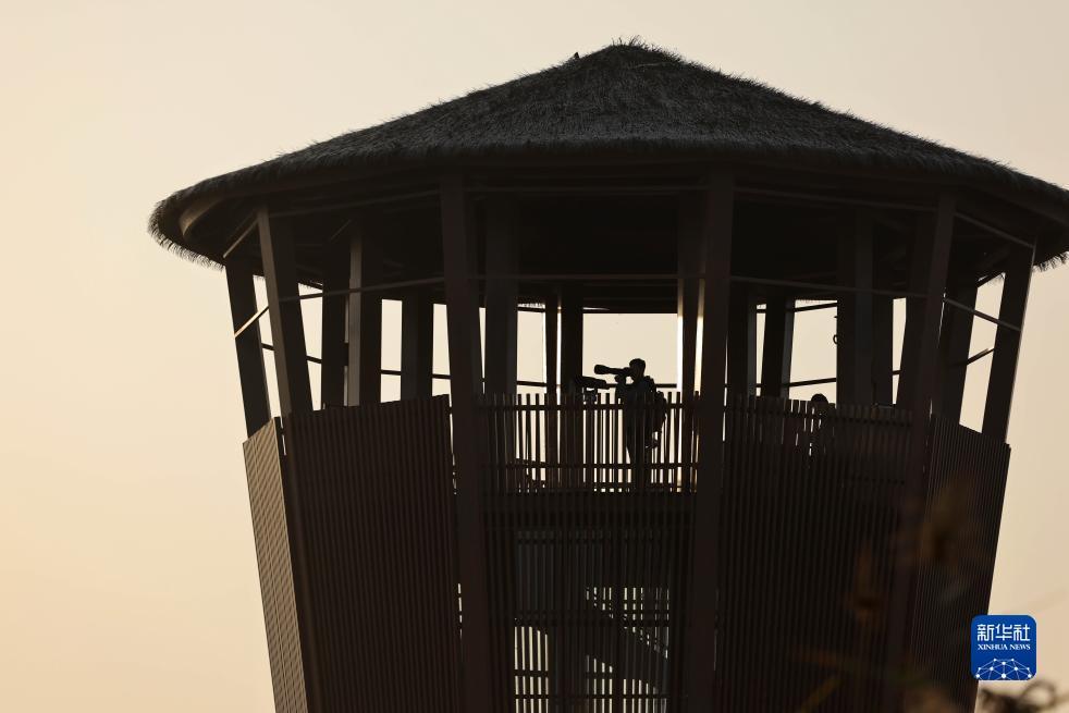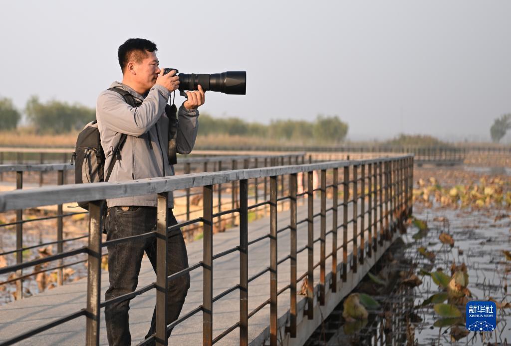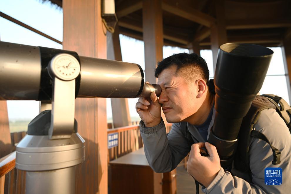 10月24日,韩战桥在雄安新区孝义河河口湿地瞭望塔观察野生鸟类。