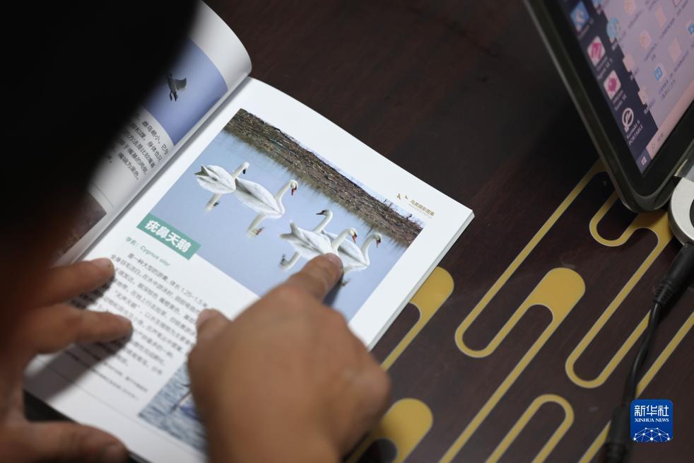 10月24日,韩战桥在雄安新区安新县家中翻看鸟类画册。