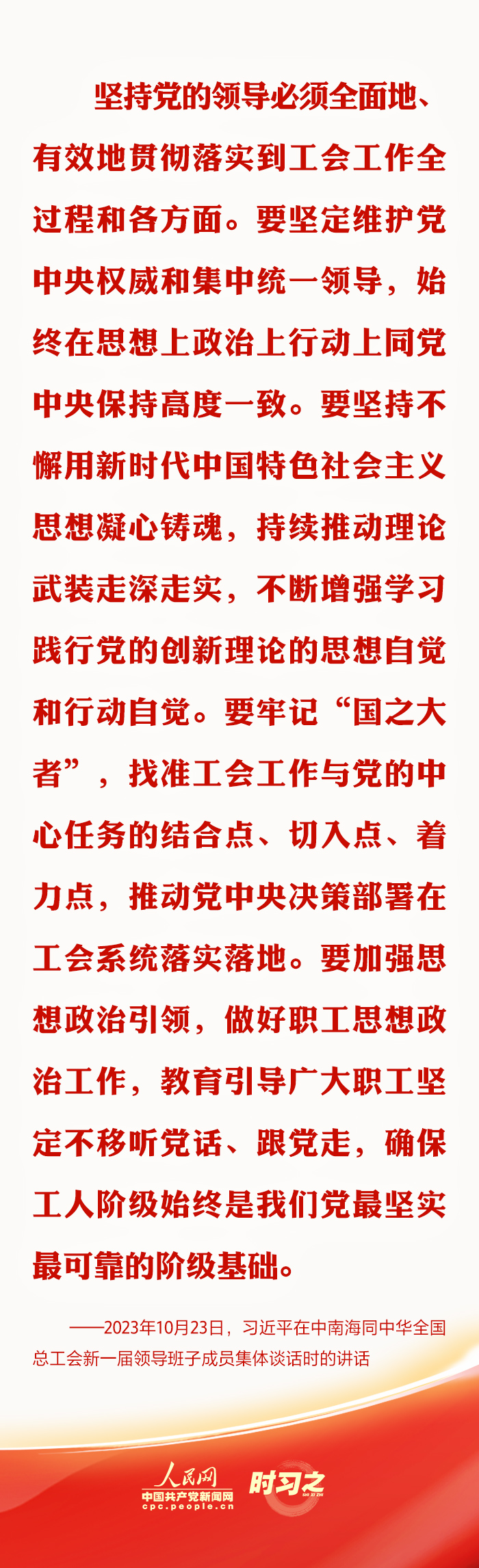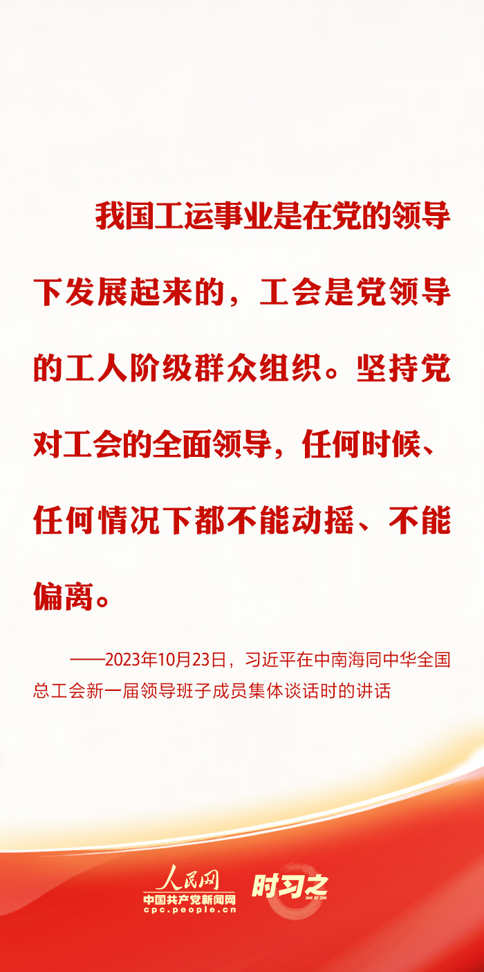 中共中央总书记、国家主席、中央军委主席习近平10月23日下午在中南海同中华全国总工会新一届领导班子成员集体谈话并发表重要讲话。“坚持党对工会的全面领导,任何时候、任何情况下都不能动摇、不能偏离。”习近平总书记在多个场合强调加强思想政治引领的重要性,指引新时代工会工作蓬勃发展。