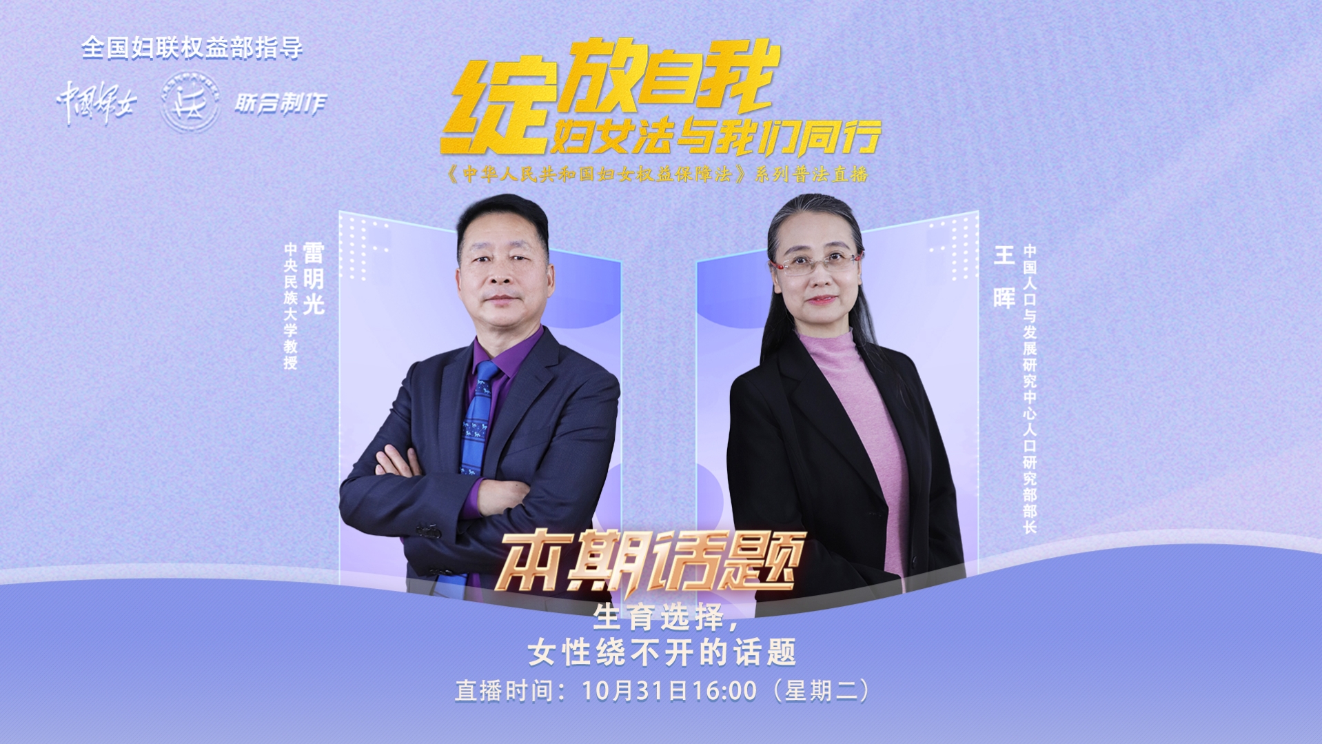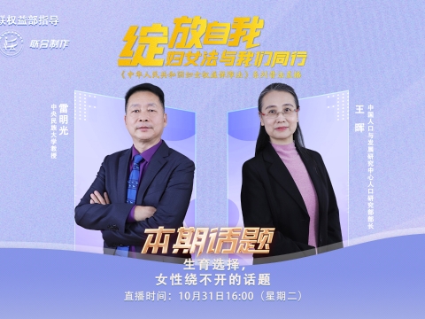 直播回顾丨《中华人民共和国妇女权益保障法》系列普法直播——生育选择,女性绕不开的话题 生育问题是很多女性绕不开的话题,在职场和生活中,女性生育与不生育,是否可以自己决定?生育全过程的安全防护你知道多少?当女性生育权益受到侵害时,如何拿起法律武器维护自身的合法权益?本期《妇女权益保障法》普法直播,特邀请中央民族大学教授雷明光,中国人口与发展研究中心人口研究部部长王晖,就生育意愿、生育方式、生育与职场、生育保障等几个方面的问题进行详细解读。10月31日16:00,中工网首页、微博、视频号同步直播!