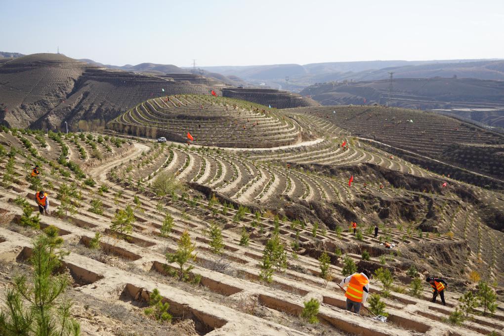 图为10月31日拍摄的甘肃省庆阳市环县毛乌素沙地防风固沙屏障项目田佛山治理点植树现场。(新华社记者 贾钊 摄)