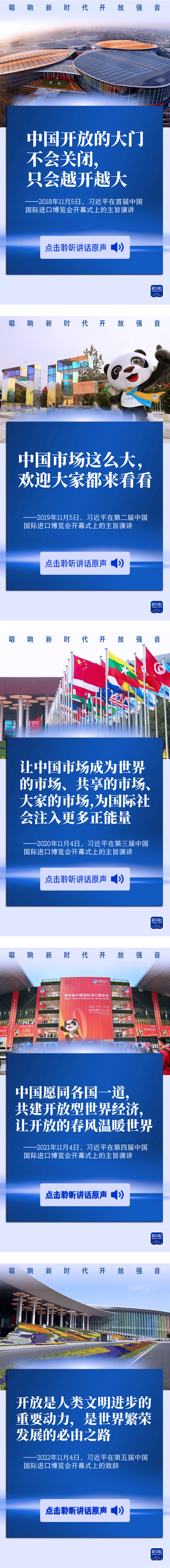 开放是当代中国的鲜明标识。习近平主席说,举办中国国际进口博览会,是中国着眼于推动新一轮高水平对外开放作出的重大决策,是中国主动向世界开放市场的重大举措。习主席在历届进博会上的重要讲话,发出开放合作的时代强音,为建设开放型世界经济注入正能量。
