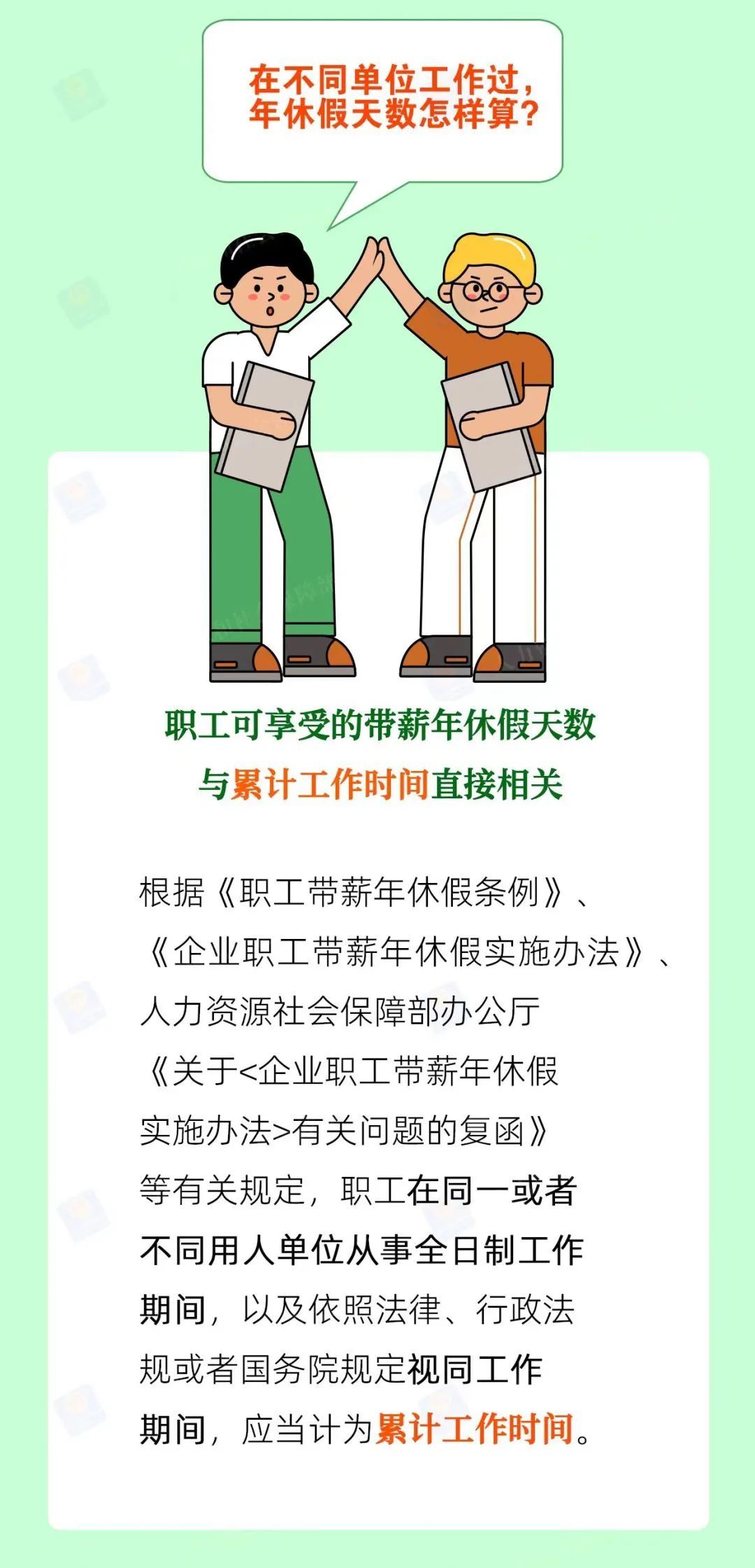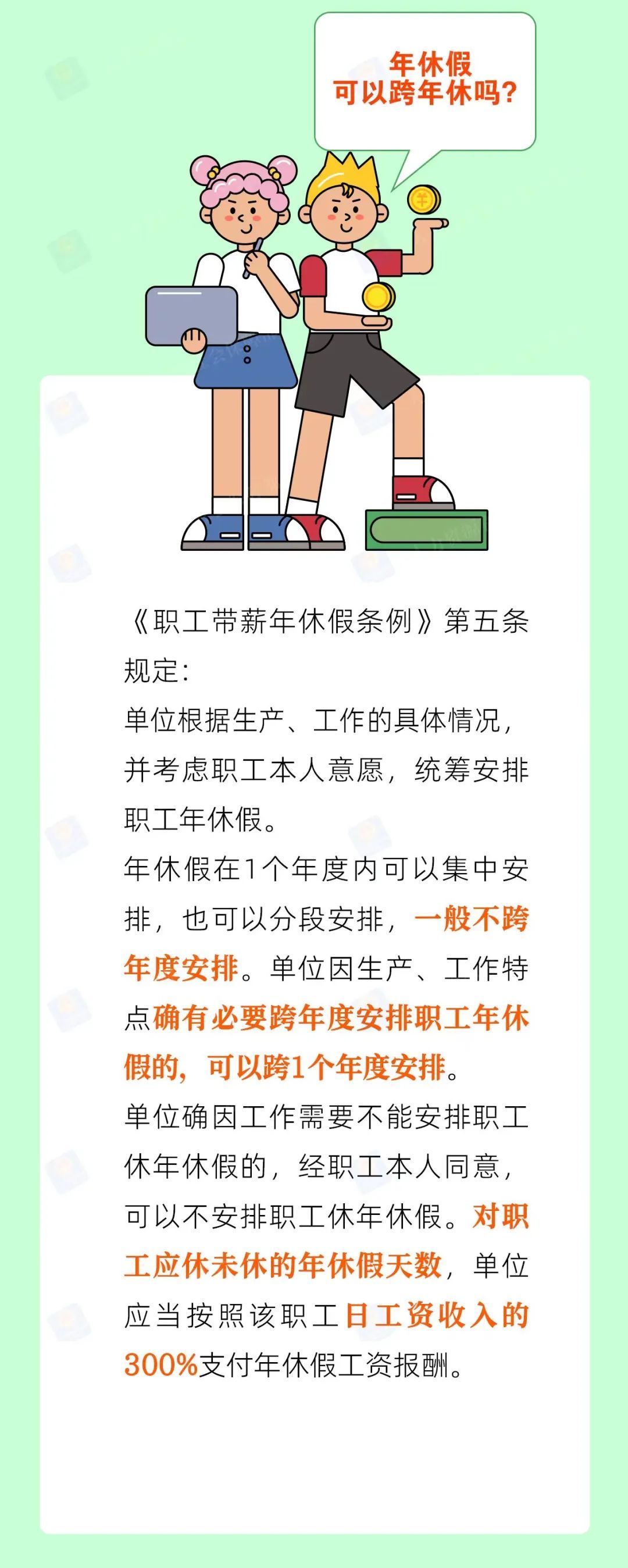 1995年,《中华人民共和国劳动法》明确我国实行带薪年休假制度,“带薪年假”成为国家赋予职工的法定权利;2008年,《职工带薪年休假条例》对休假主体、休假条件、休假天数等做出明确规定。其中规定:职工累计工作已满1年不满10年的,年休假5天;已满10年不满20年的,年休假10天;已满20年的,年休假15天。单位确因工作需要不能安排职工休年假的,经职工本人同意,可以不安排职工休年假。对职工应休未休假天数,单位应当按照该职工日工资收入的300%支付年休假工资报酬。