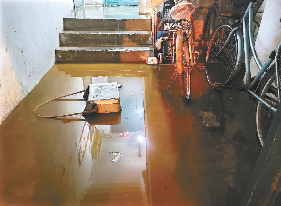 柴家湾1号楼东门2层居民家中暖气管道爆裂,积水最深时需要垫着砖块才能在1层楼道通行。