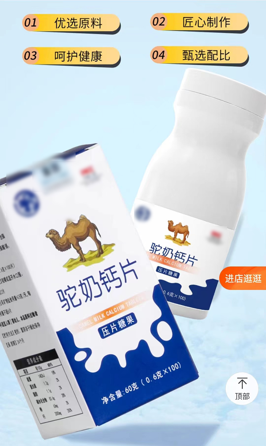 这些产品大多叫做高钙凝胶糖果、乳钙软糖、牛奶钙片等。其中,一款驼奶钙片每500克的售价为153元,卖家表示,原料使用的是“温和驼乳钙”,钙含量高且营养易吸收。不过从包装标注来看,它仅是一款压片糖果。
