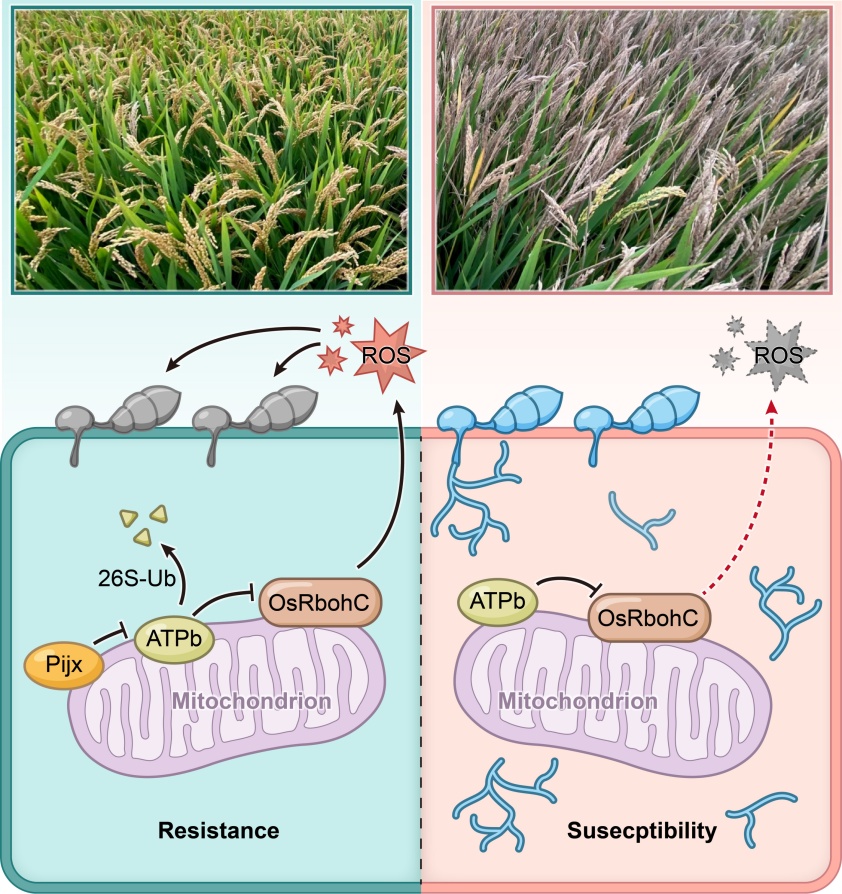 由稻瘟病菌引起的稻瘟病是水稻最重要的真菌病害之一,利用抗病基因防治该病害是最为经济、有效、环保的方法。该研究通过全基因组关联分析,在水稻第12号染色体上鉴定到一个与稻瘟病抗性相关的新基因Pijx,该基因具有全生育期广谱抗性;Pijx蛋白与ATP合成酶β亚基互作并促进其泛素化降解,从而激活呼吸爆发氧化酶的活性,诱导活化氧爆发,使水稻株系获得抗性。