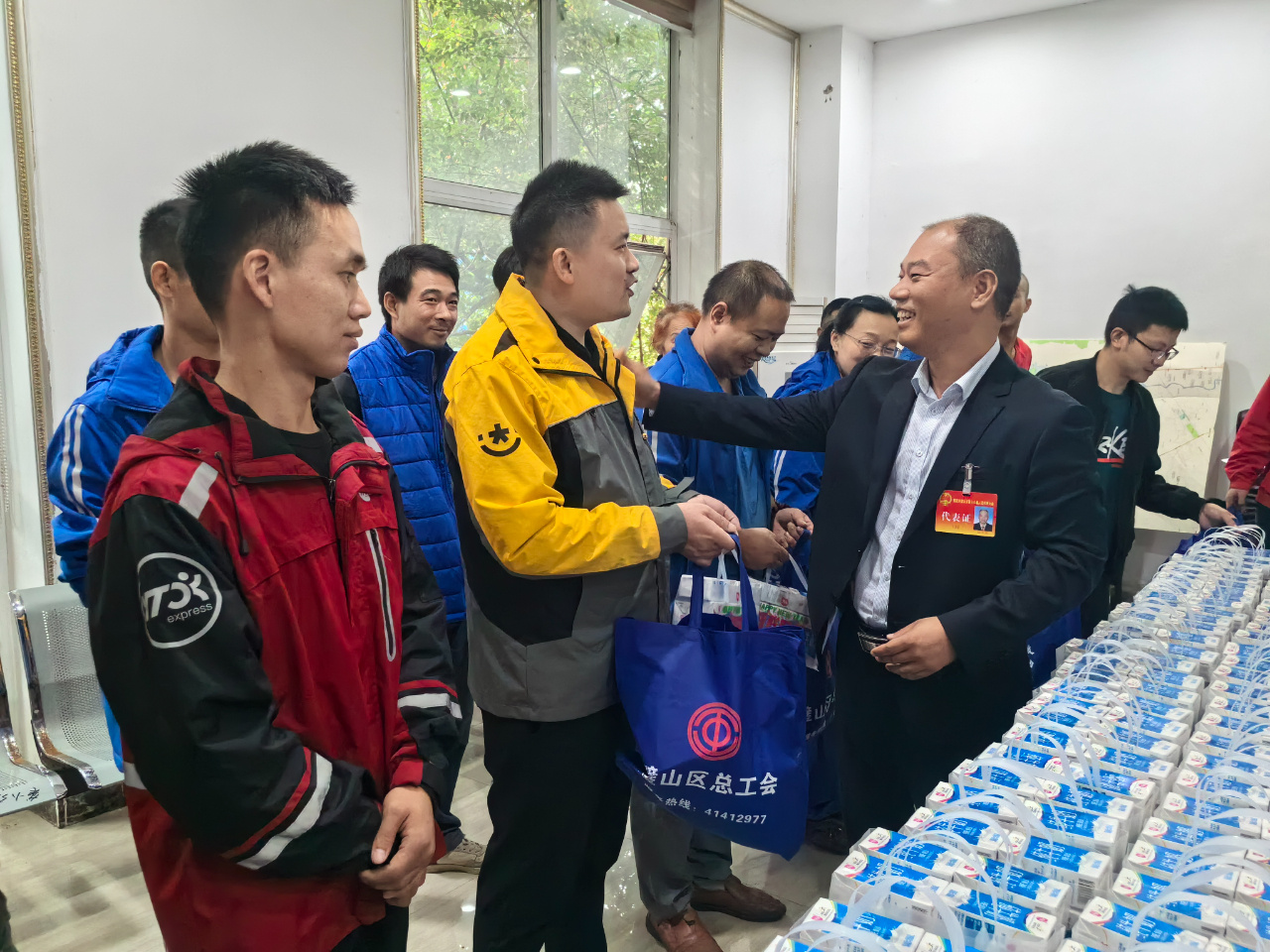 随着“双十一”快递高峰的到来,璧山区总工会组织开展了2023年“新就业形态劳动者和农民工温暖服务季”慰问活动,向一线快递员送去牛奶、面包,预防感冒及外伤急救等药品。