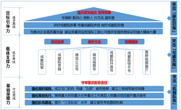 推进媒体融合提升宣传影响力,成为当前成都院宣传思想工作重要着力点。从保障层、载体层、目标层三个层面为架构,提升保障力、支撑力和引导力,形成良性改进循环体系。