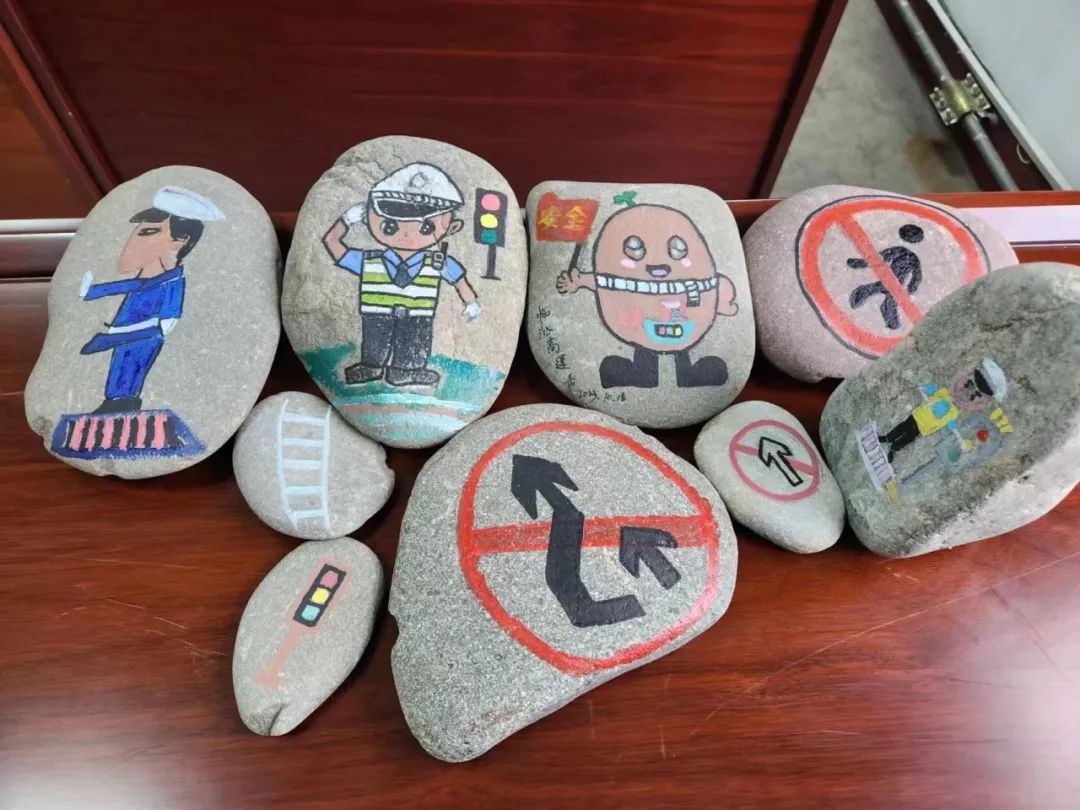 临洮高速公路大队专门前往甘肃洮河石文化博物馆参观学习,在洮河边捡取创作石头,精心组织大队全体人员将稳驾慢行、拒绝酒驾、文明礼让等交通安全元素融入传统文化石画艺术形式当中,并通过“七进”宣传等群众喜闻乐见的形式,将“交通安全石”送到群众手中,把交通安全的“种子”播进群众心里。