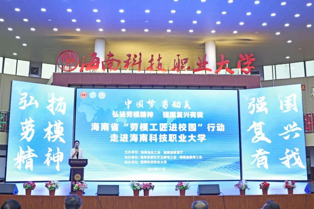 本次活动由海南省总工会、省教育厅主办,省教科文卫邮电工会、省教育工会协办,海南科技职业大学承办。当天,海南省劳模工匠宣讲团成员、海南科技职业大学教职工代表和学生代表500余人参加宣讲活动。