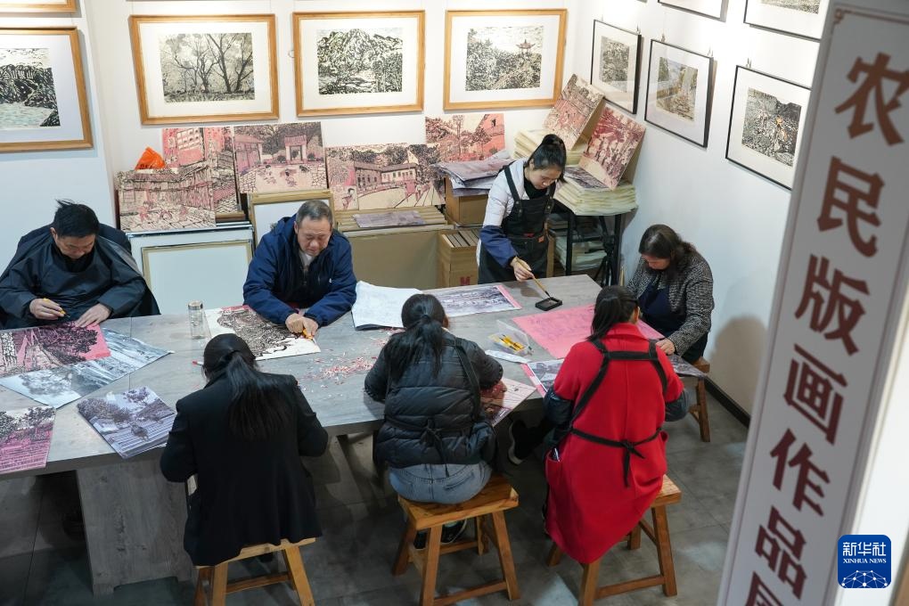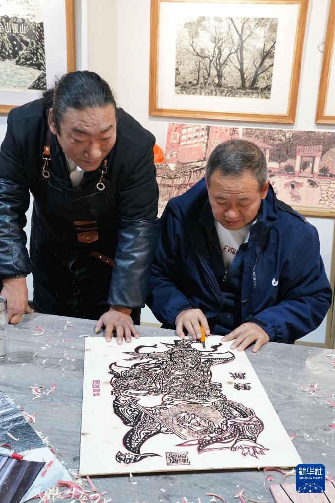 11月22日,农民版画合作社社员和老师在旬阳市版画院内刻版创作。