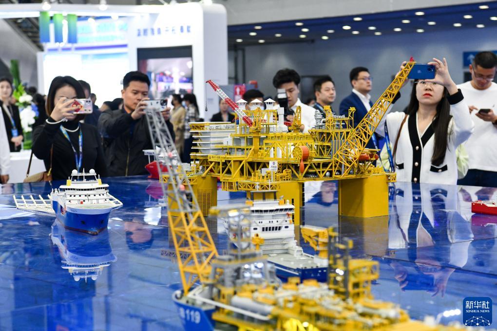 11月23日,观众在现场观看中集集团展出的蓝鲸1号钻井平台模型。新华社记者 梁旭 摄