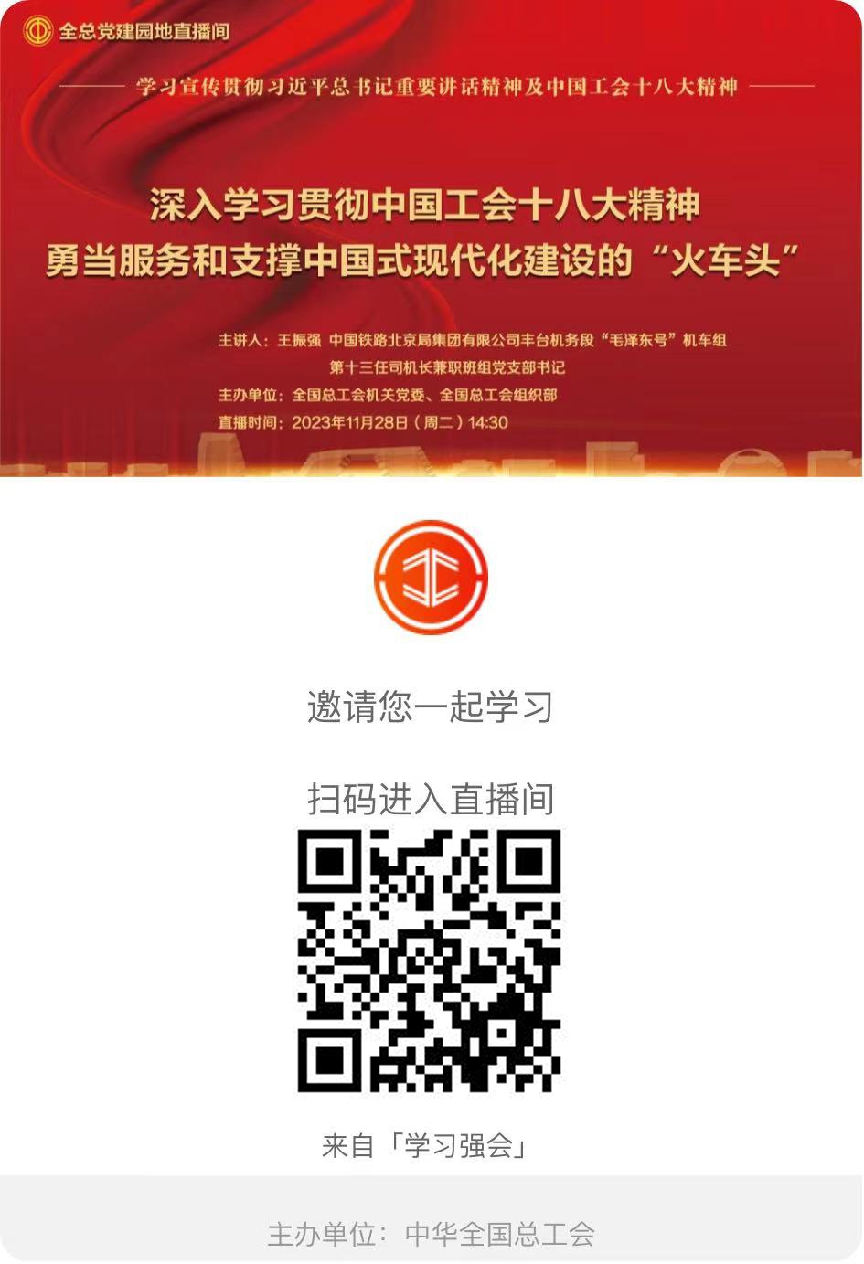 为学习宣传贯彻习近平总书记同全国总工会新一届领导班子成员集体谈话时的重要讲话精神及中国工会十八大精神,引导各级工会干部围绕中心、服务大局,积极进取、主动作为,努力完成中国工会十八大确定的目标任务,全国总工会机关党委、全国总工会组织部在全国总工会视频号、学习强会、全国工会干部教育培训网、技能强国-全国产业工人学习社区进行学习宣传贯彻习近平总书记重要讲话精神及中国工会十八大精神专题直播。