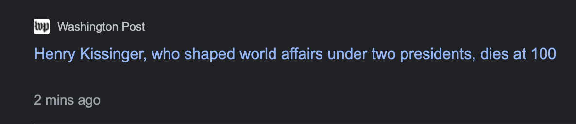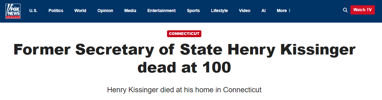 当地时间11月29日,美国《华盛顿邮报》、美国福克斯新闻网等多家媒体均报道了基辛格去世的消息。