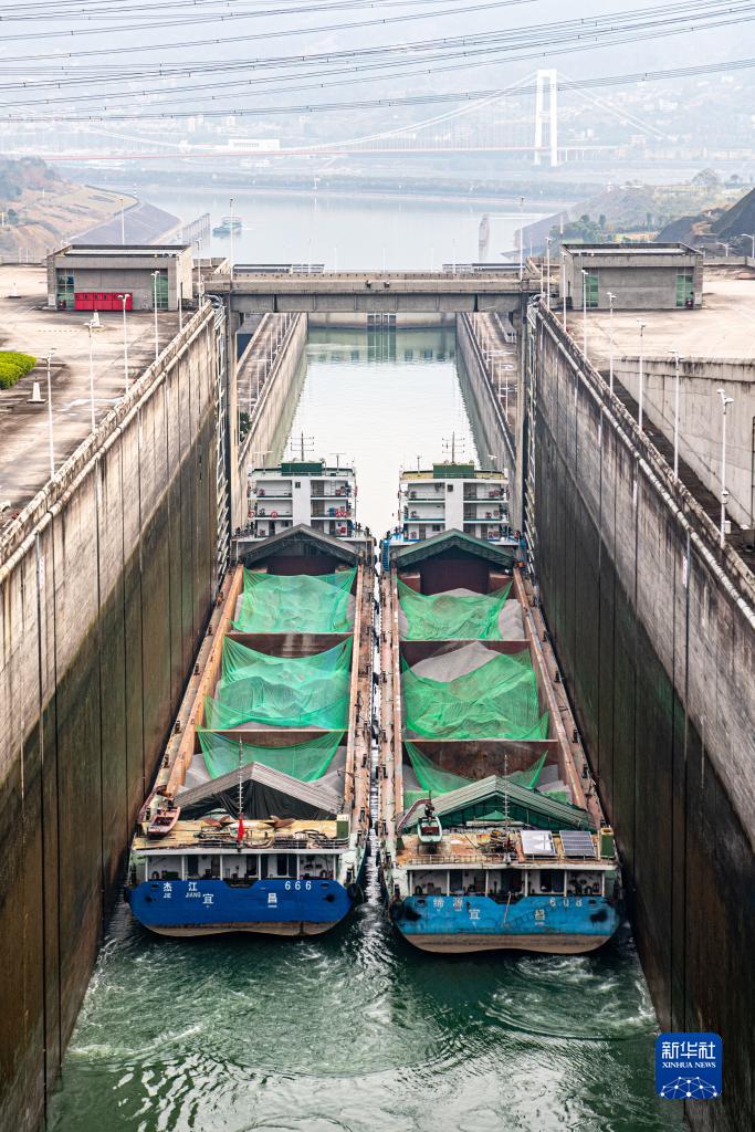 12月1日,船舶有序通过三峡双线五级船闸(无人机照片)。新华社发(郑家裕摄)