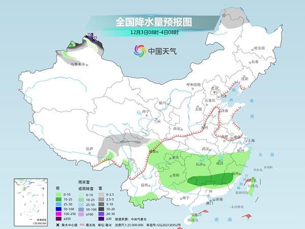 明天,新疆北疆北部等地部分地区有中到大雪或雨夹雪,高海拔地区有暴雪或大暴雪,局地特大暴雪。江南大部、西南地区东部、华南北部、海南岛、台湾岛等地部分地区有小到中雨。
